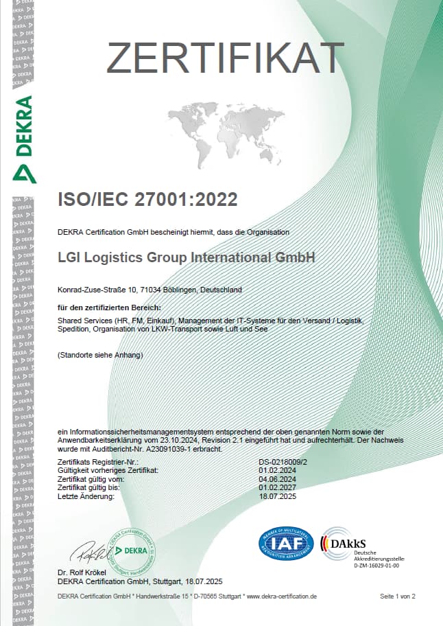 Als Inhaber der ISO 9001:2015-Zertifizierung weist die LGI nach, dass sie ein funktionierendes Qualitätsmanagementsystem hat. Bereits seit 1997 ist die LGI nach ISO 9001 zertifiziert. Für unsere Kunden bedeutet das, dass sie mit einem strukturierten und organisierten Unternehmen zusammenarbeiten, das auf die Kundenbedürfnisse eingeht und sein Geschäftsmodell auf die Zukunft ausrichtet.